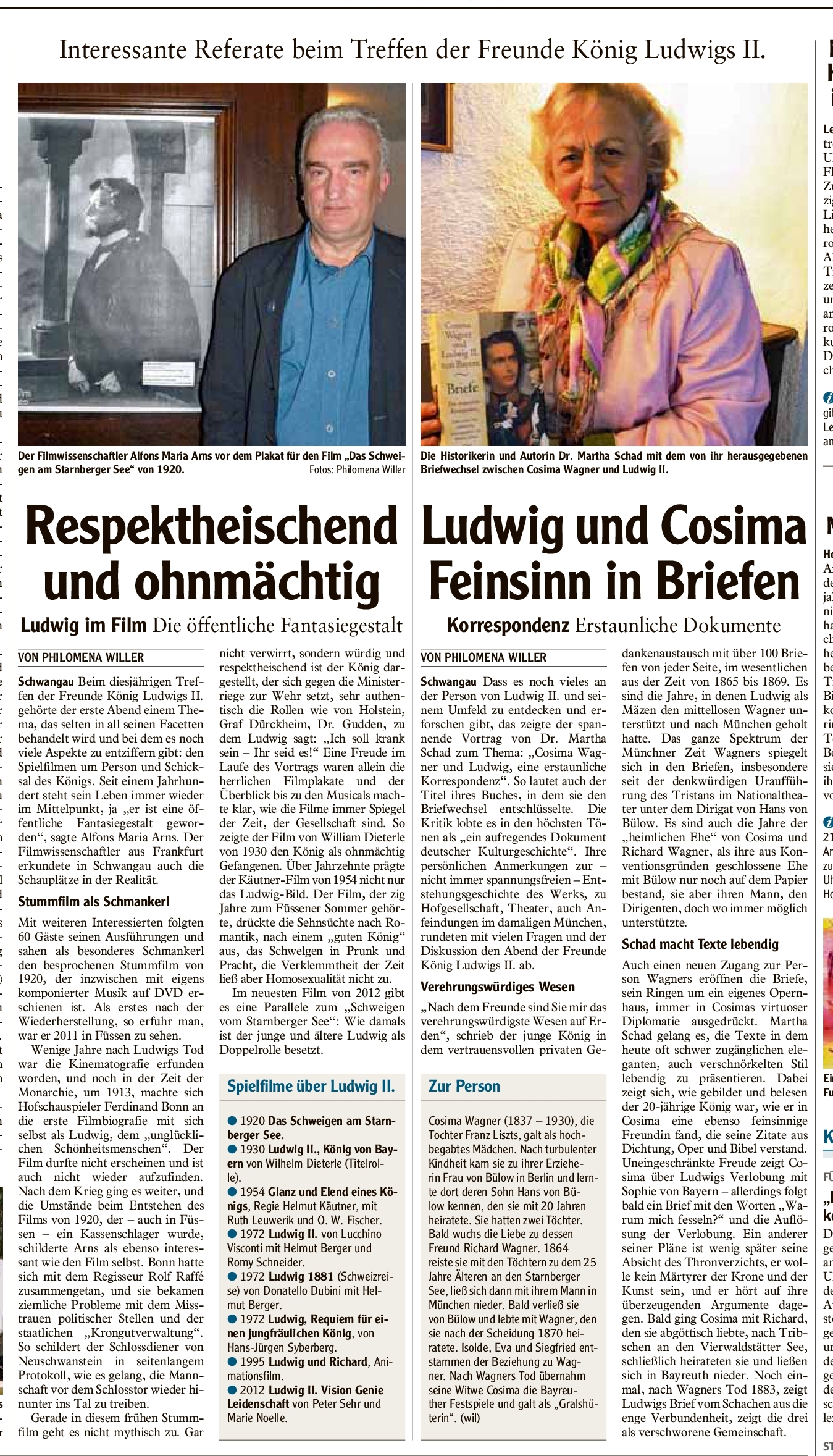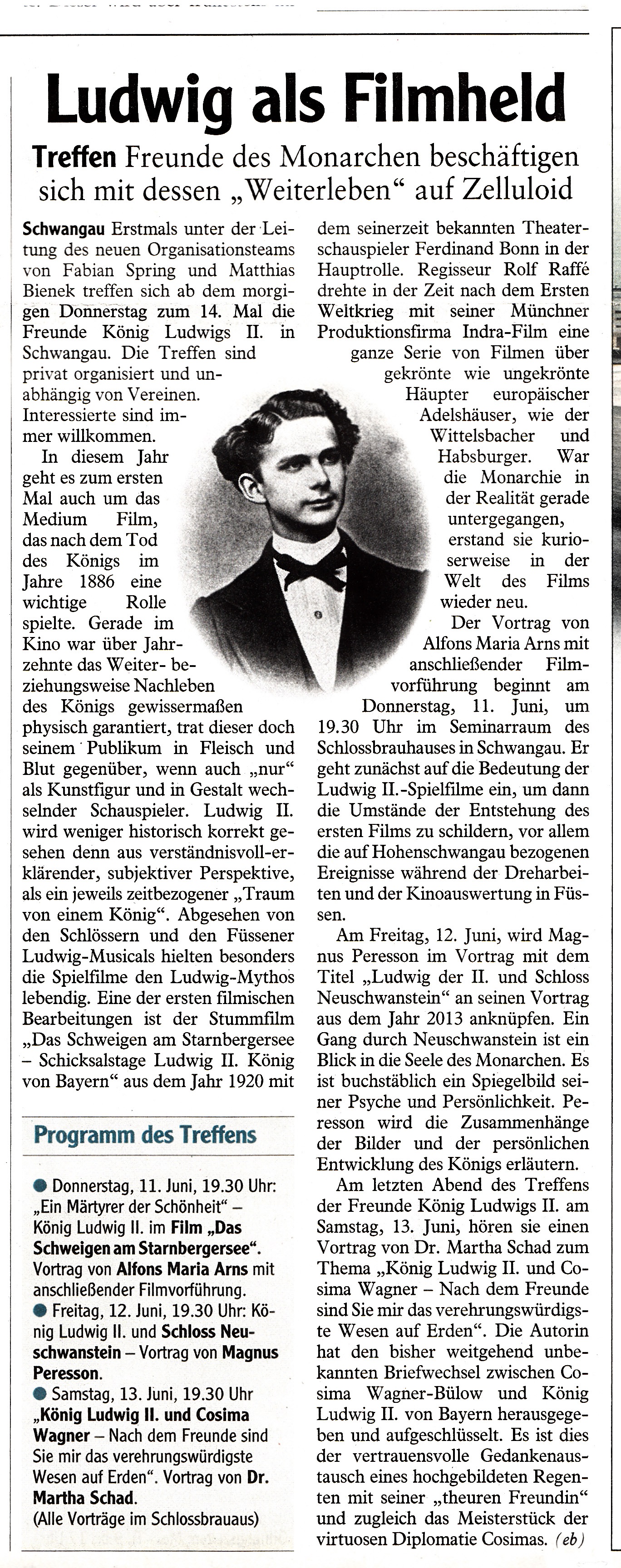 das Treffen der Freunde König Ludwig II. liegt nun schon wieder 3 Wochen zurück. Nun wird es aber auch Zeit den Daheimgebliebenen von unseren Vorträgen und Erlebnissen zu berichten. Im Vorfeld des Treffen erschien bereits am 8.6.2015 ein Artikel im Füssener Blatt den ich euch hier präsentieren möcht. Diesen Artikel seht ihr auf der linken Seite. Auf der rechten Seite findet ihr die beiden Artikel zu den Vorträgen von Alfons Maria Arns und Dr. Martha Schad. Das nachfolgenden Bilder sind nur Vorschaubilder! Durch Anklicken des Bildes wird ein neues Browserfenster geöffnet und der Artikel kann in Originalgröße angeschaut werden.